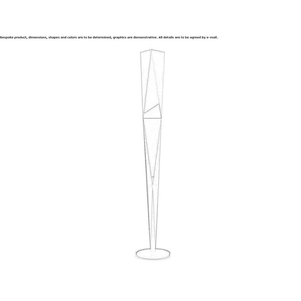 Ta lampa podłogowa dająca światło pośrednie, z charakterystycznymi ostrymi narożnikami i krawędziami, powstała w wyniku złożenia cienkiej blachy aluminiowej. Konstrukcja jest zamontowana na stalowej podstawie z możliwością obrotu o 320°.