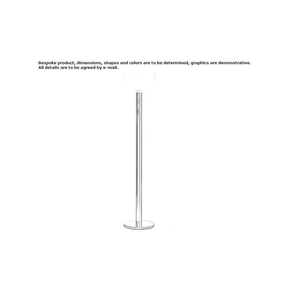 Lampa podłogowa o chromowanej konstrukcji. Klosz z opalowego białego szkła dla wersji AM2C oraz z chromowanego, czarnego chromowanego lub białego metalu dla wersji AM2Z. Rozsył strumienia świetlnego w górę, ściemniacz na kablu.