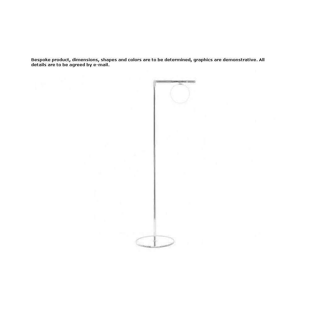 Metalowa lampa podłogowa w kolorze matowego mosiądzu lub chromu, z kloszem ze szkła opalowego. Zbudowany z podwójnym przegubem kulowym, który umożliwia obrót o 360°, a także podnoszenie na wysokość. Oprawka G9 z żarówką.