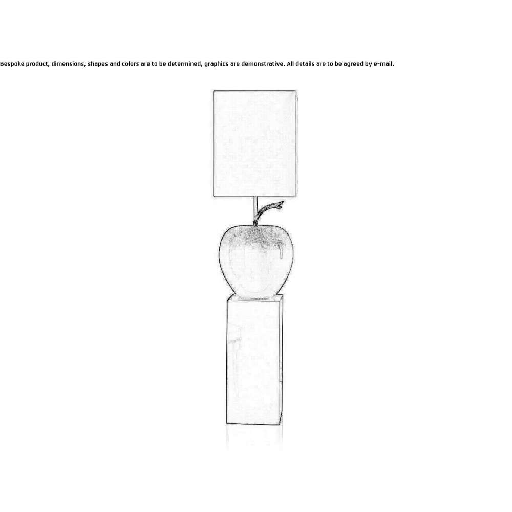 Z483 to lampa podłogowa z ręcznie toczonym i szkliwionym jabłkiem majoliki. Detale ze szczotkowanego chromowanego mosiądzu i drewniana podstawa lakierowana na biało. Klosz z białego perkalu ze srebrnym wnętrzem.