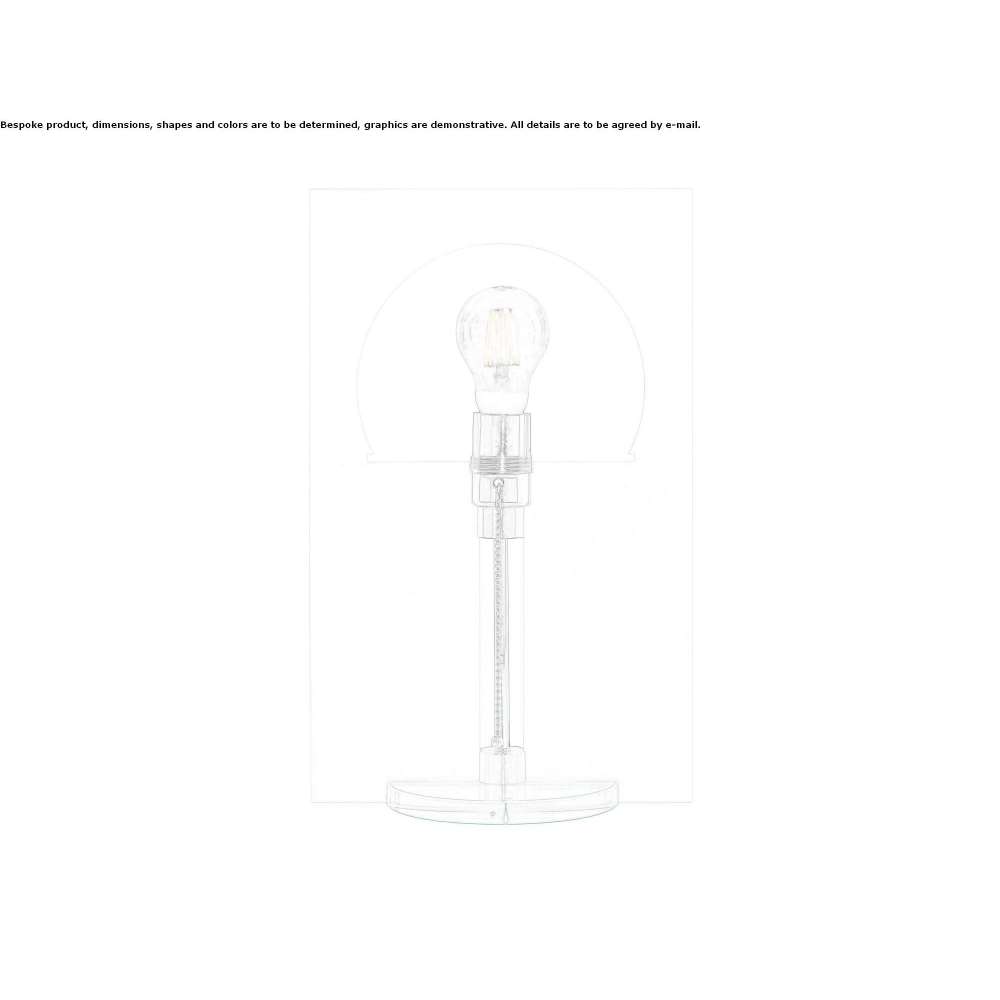 Metalowa oprawka na szklanej podstawie to centralny element lampy. Uderzającą cechą jest jednak satynowana szklana płyta, w której wycięta jest sylwetka lampy Bauhaus. Przełącznik pociągany w postaci metalowego łańcuszka z koralikami i czarny bawełniany kabel ze ściemniaczem sznurkowym to kolejne ważne cechy, które definiują projekt tej oprawy.