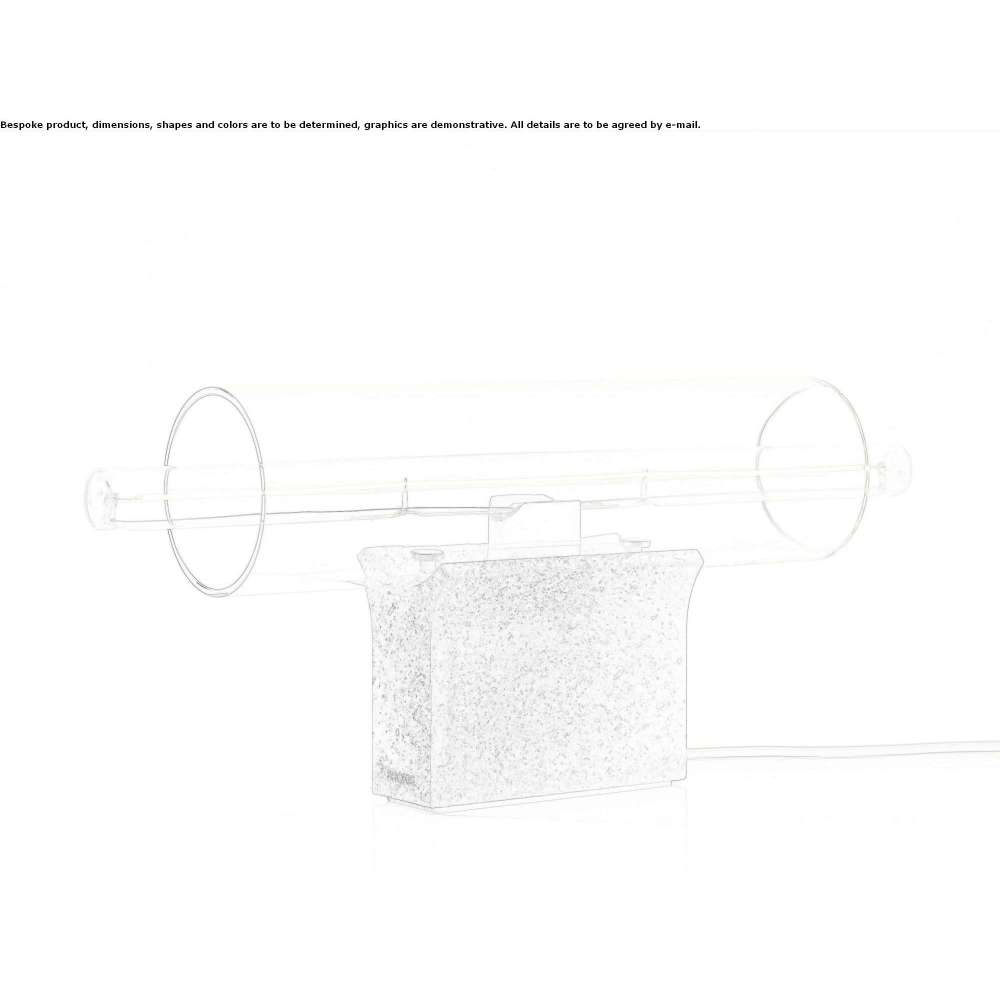 OVERLAY to lampa stołowa LED z dmuchanego szkła. Nakładka wykonana jest z trzech różnych rodzajów szkła: świetlówka wykonana jest z ręcznie dmuchanego szkła; betonowa podstawa jest osadzona odłamkami szkła o grubości 3-4 mm, co zapewnia atrakcyjny element estetyczny; a tłuczone szkło stosuje się zamiast piasku jako główne spoiwo w podłożu betonowym.