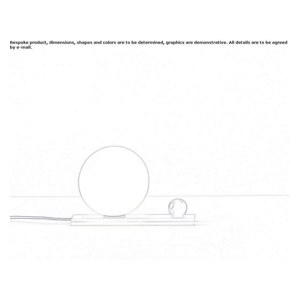 Nash – moja teoria gier: dopóki nie zmieni się kontekst, małe kule pozostaną w równowadze. Oprawa ścienna lub stołowa z konstrukcją z mosiądzu lub aluminium. Wykończenia surowy mosiądz lub malowany, dmuchany szklany dyfuzor opalowy. W komplecie lampa LED.