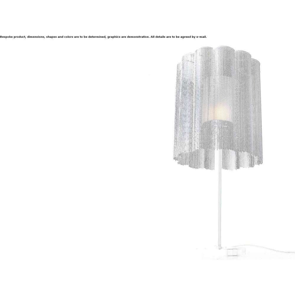 Prosta, klasyczna lampa stołowa z zapiekanką Cropped. Wykonane z wycinanych laserowo ram ze stali nierdzewnej, chromowanych lub lakierowanych, elementów z litego mosiądzu i łańcuszka kulkowego w kilku opcjonalnych wykończeniach. Oświetlane kulą ze szkła żaroodpornego zawierającą lampę halogenową G9 lub LED.