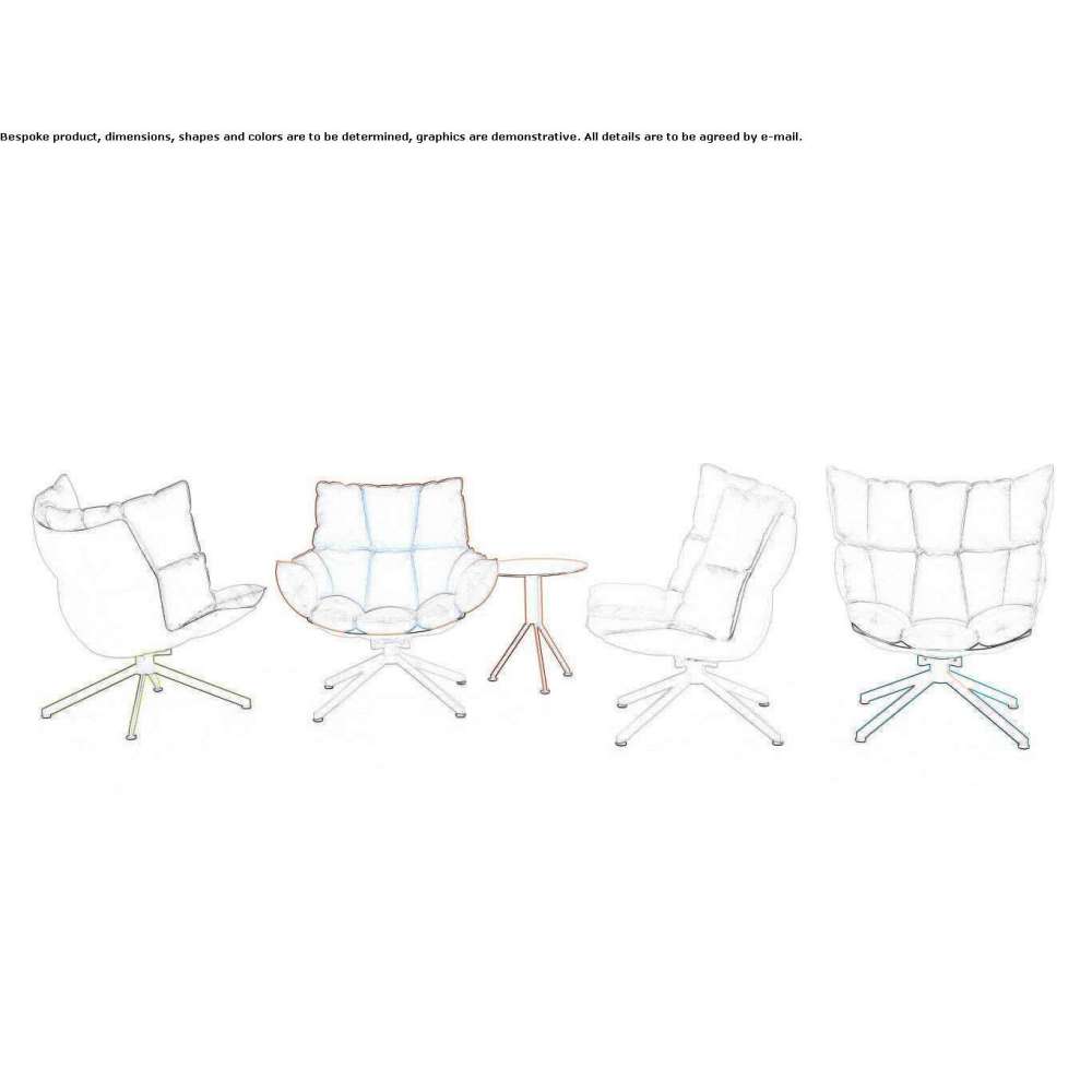 Husk Outdoor posiada twardą skorupę wykonaną z Hirek® i zestaw miękkich poduszek, które wyrażają oryginalny język projektowania będący hołdem dla miękkości. Korpus jest biały, a stałe wsporniki siedziska są dostępne w malowanych odcieniach bieli, czerni, pomarańczy, kwaśnej zieleni i błękitu nieba. Poduszki występują w dwóch wersjach, z większymi rozmiarami na siedzisku lub oparciu, i pokryte są tkaniną techniczną dostępną w pięciu odcieniach: biały, beżowy, pomarańczowy, kwaskowa zieleń, błękitny. Przepuszczająca wodę wyściółka umożliwia przenikanie wody przez poduszki bez zastoju. Husk Outdoor jest wynikiem szeroko zakrojonych prac skupionych na doskonaleniu przedmiotu i umiejętnym zachowaniu oryginalnych cech, które czynią ten przedmiot wyjątkowym. Fotel wzbogaca mały okrągły stolik Husk, dostępny w jednym rozmiarze (ø 45 cm, h 48 cm), który podkreśla lekkość i elastyczność użytkowania. Pomalowany na jeden kolor, dostępny jest w pięciu odcieniach (biały, czarny, kwaskowa zieleń, pomarańczowy i błękitny), w tych samych kolorach co wspornik fotela.