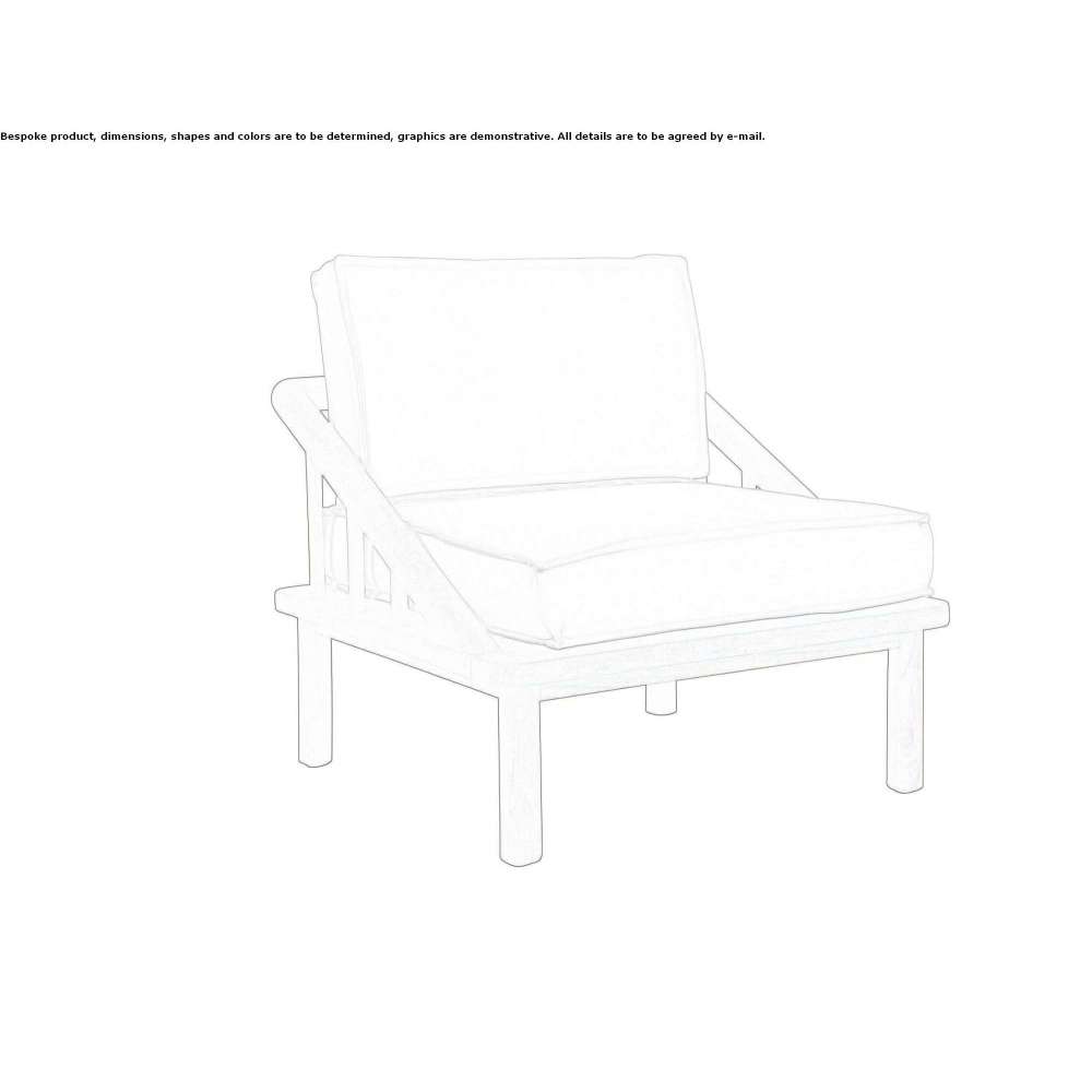 Krzesło z siedziskiem i oparciem złożonym z grubych poduszek i konstrukcji z drewna tekowego. Poduszki są ważne w tej kolekcji: krzesło utrzymuje się jedynie na drewnianej konstrukcji, a siedzisko i oparcie to jego główne cechy.