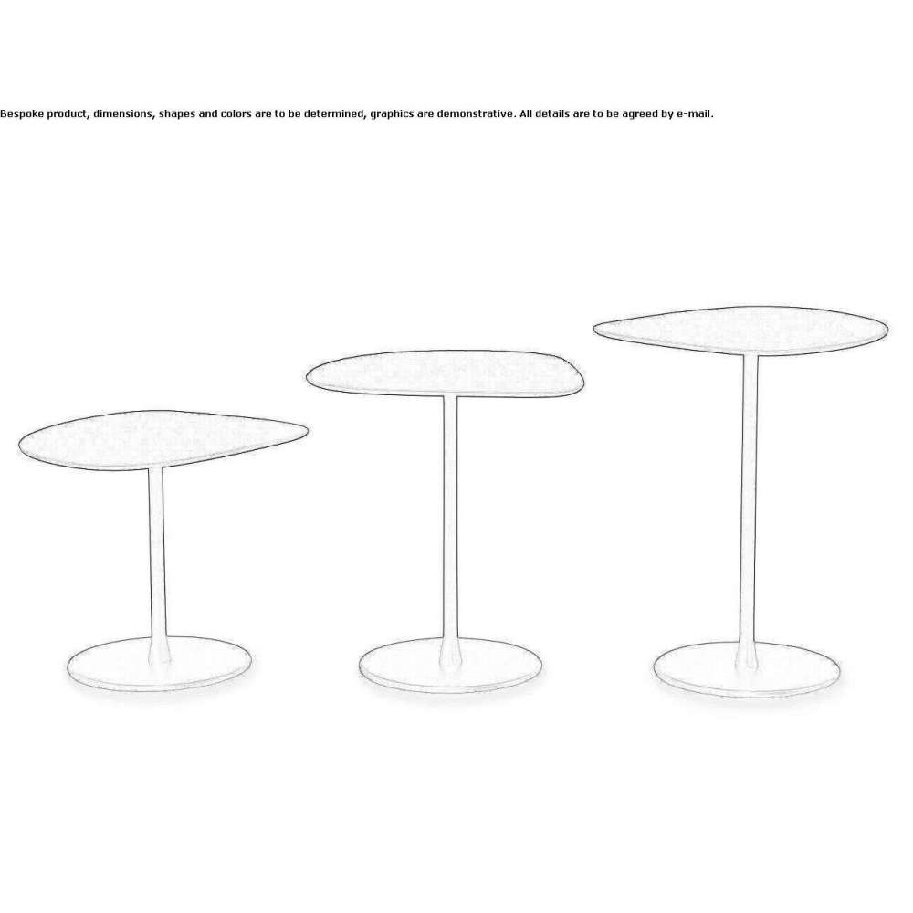 Mały stolik z blatem z warstwowego lub malowanego laminatu. Rura stalowa i podstawa pomalowane w tym samym kolorze co blat. Dostępne również z ceramicznymi blatami o średnicy 6 mm, odpowiednie również do użytku na zewnątrz.