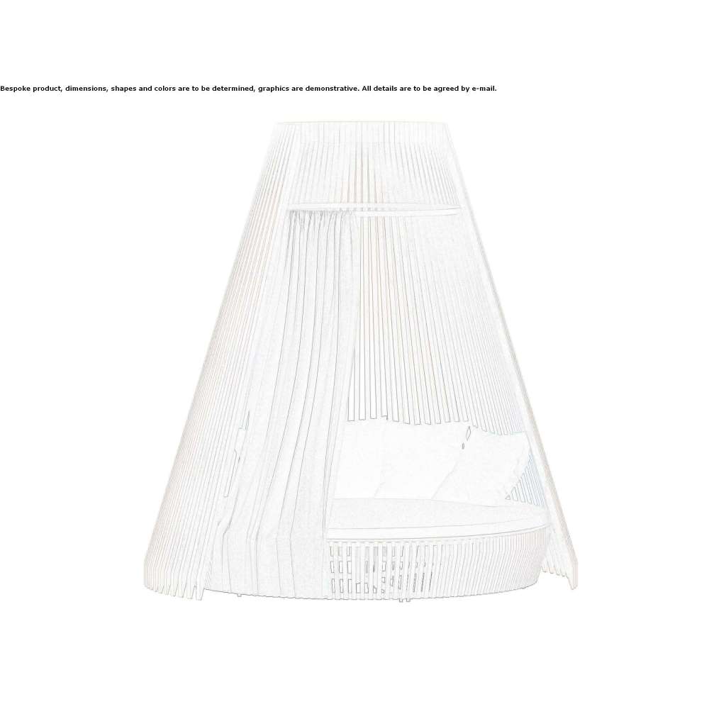 Chata to znacznie więcej niż meble ogrodowe, jej proporcje „podnoszą” ją do prawdziwej architektury z modrzewia syberyjskiego, tego drewna o niezwykłych właściwościach, które doskonale wytrzymuje użytkowanie na zewnątrz i zachowuje swoje naturalne piękno w miarę upływu czasu. Struktura tego wspaniałego gniazda, wywierająca silny efekt wizualny, składa się z szeregu długich „łodyg” ułożonych w kształt wigwamu z wstawkami i detalami z metalu, które otaczają obszerne, okrągłe siedzenia, wyjątkowo wygodne dzięki miękkim poduszkom.