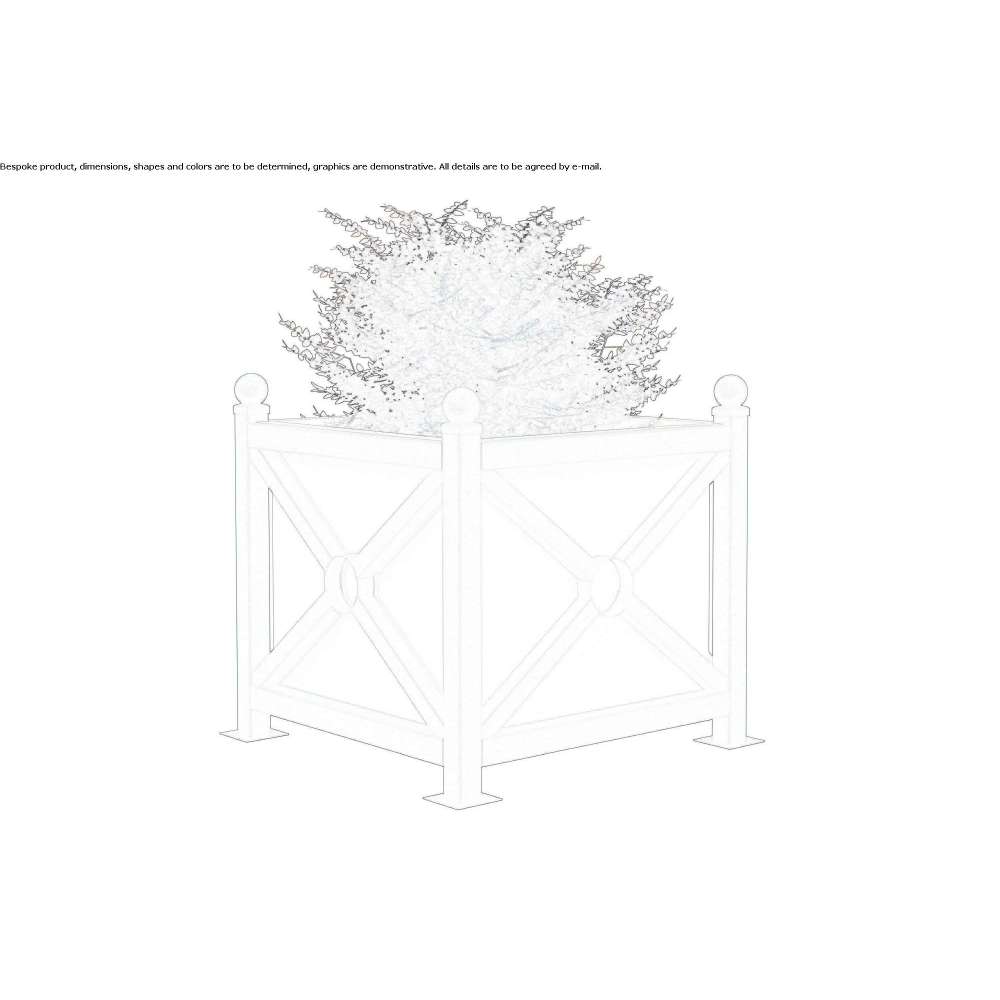 Kwadratowa donica wykonana ze stali ocynkowanej i malowanej proszkowo farbą epoksydową w kolorystyce RAL. Ozdobne dekoracje wykonane z okrągłej stali mm 20. Wewnętrzna donica na rośliny wykonana z blachy stalowej.