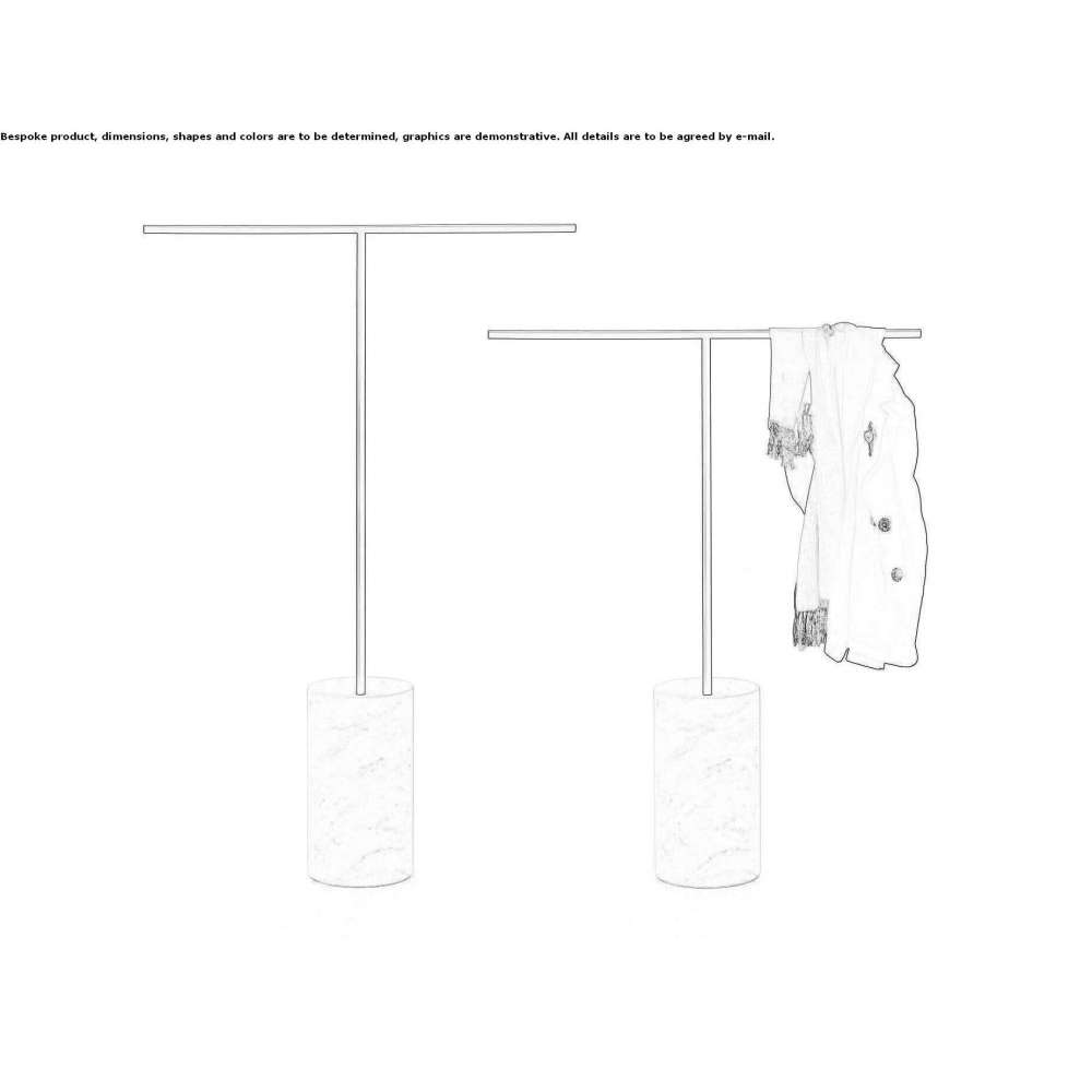 TONBO to wieszak na ubrania dostępny w dwóch wysokościach, składający się z podstawy wyrzeźbionej z pojedynczego bloku czarnego marmuru Marquina, białego marmuru Carrara lub czerwonego marmuru Levanto z satynowym wykończeniem i nieprzezroczystym przezroczystym lakierem ochronnym; lub w betonie o wysokiej wytrzymałości, wykończonym hydrofobową powłoką ochronną, z osadzoną wkładką stalową. Rama złożona z dwóch elementów z rur stalowych Ø20 mm, połączonych ze sobą za pomocą śruby, lakierowanych farbą proszkową epoksydową w kolorze brązowo-szarym, przymocowanych do podstawy za pomocą perforowanej blachy.