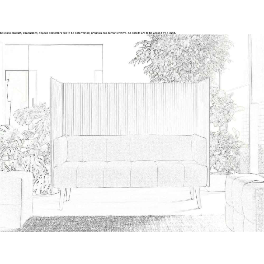 Tylne oparcie z gładkiej lub termoformowanej tkaniny dźwiękochłonnej. To modułowy system foteli i sof, z niskim lub wysokim oparciem, na nóżkach lub na podłodze, zaprojektowany z myślą o zapewnieniu przytulności przestrzeni publicznych i prywatnych.