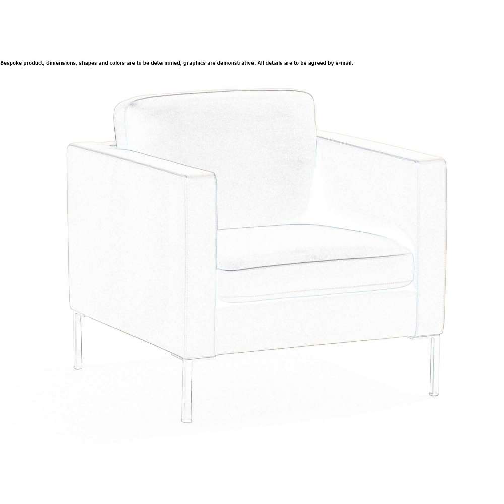 Wymiary: H: 30 11 ⁄ 16” L: 31 1 ⁄ 2”, D: 32 5 ⁄ 16”, H: siedzisko 16 9 ⁄ 16”. Ta rodzina foteli, sof i ławek z chromowanymi metalowymi nóżkami, charakteryzująca się o smukłych, eleganckich liniach, są idealnym wyposażeniem każdego wnętrza. Konstrukcja składa się z drewnianej ramy pokrytej nieodkształcającą się, ekspandowaną wyściółką poliuretanową o różnej grubości oraz włóknami poliestrowymi, z siedziskiem na elastycznych paskach, gwarantujących optymalny komfort. Tapicerka dostępna jest w tkaninie lub skórze, mocowana do konstrukcji i zdejmowana w przypadku poduszek.