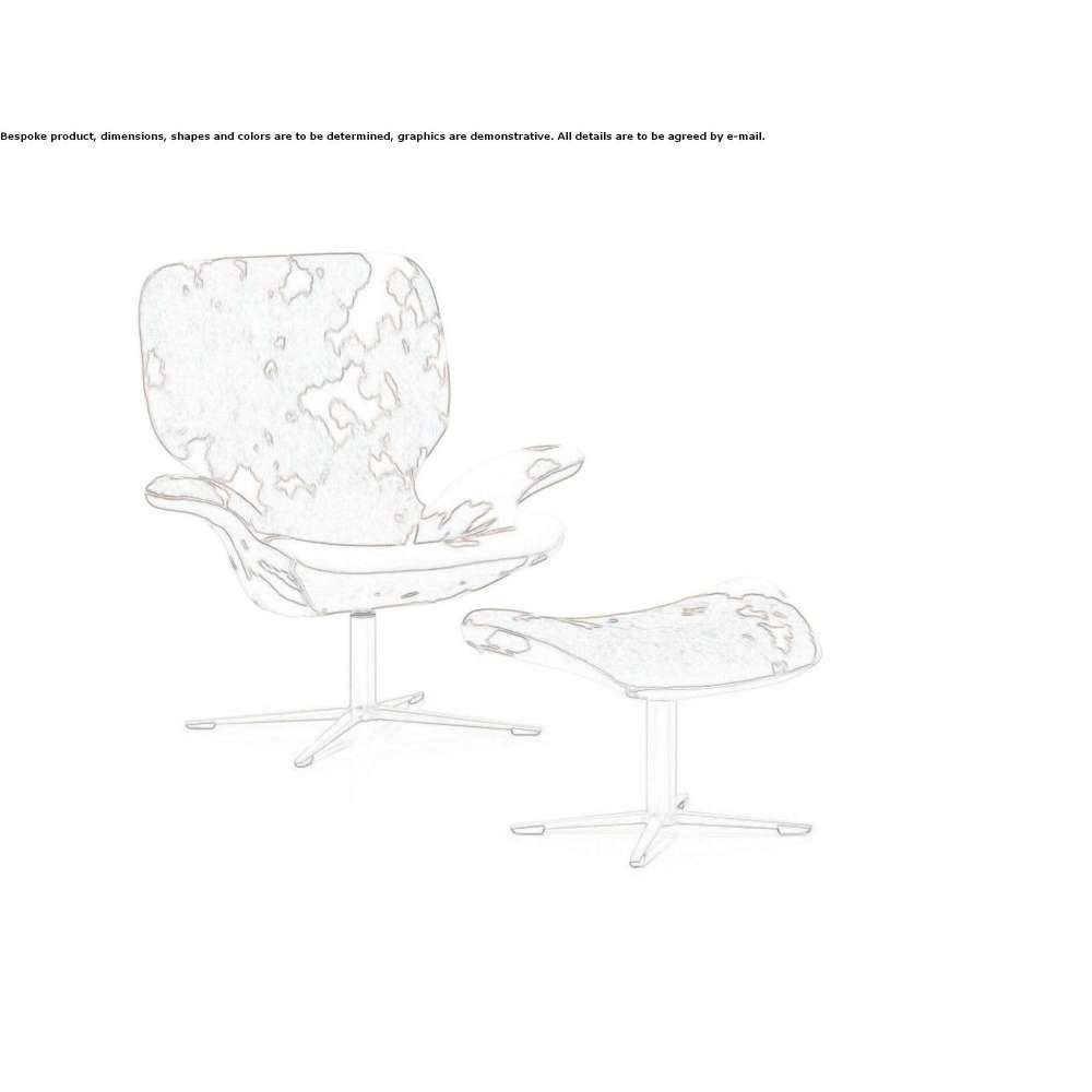 Fotel ze skorupą z pianki zimnej z metalową wkładką. Pufa skoordynowana. Sugerujemy pokrowce skórzane lub jednokolorowe. Skóra bydlęca nakrapiana dostępna jest w kolorze czarno-białym lub biało-czarno-brązowym. W przypadku pokrowców łączonych skóra-tkanina patrz cena w kategorii skóra. Naprawiono osłonę.