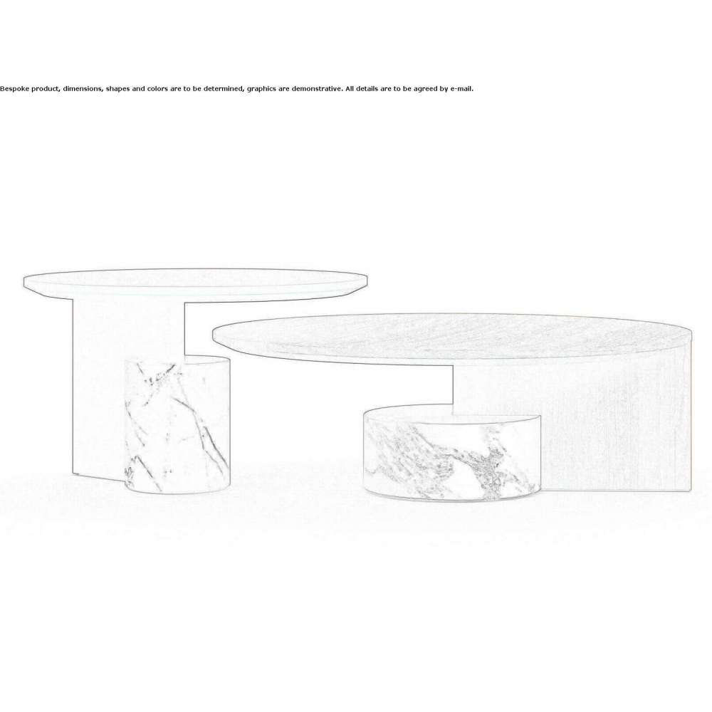 Sofę Sengu uzupełniają trzy niskie stoliki, które można łączyć lub używać pojedynczo. Ich obszerny okrągły blat i panel nośny są lakierowane lub w tej samej ciepłej esencji drewna co konstrukcja sofy – orzech Canaletto lub bejcowany czarny dąb – natomiast podstawa jest dostępna w różnych marmurach.
