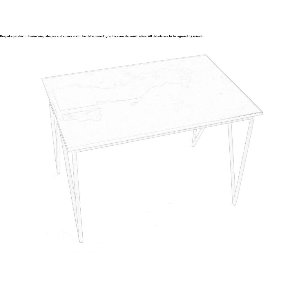 Górna część ze szkła płaskiego z zeszkloną serigrafią. Podstawa ze stali malowanej proszkowo.