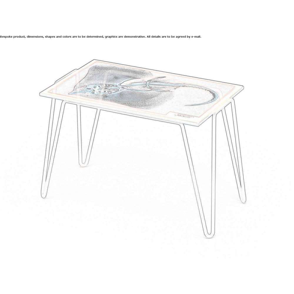 Xraydio to stół z blatem ze szkła płaskiego z wkładką z folii z nadrukiem i podstawą ze stali z wykończeniem Raw Black.