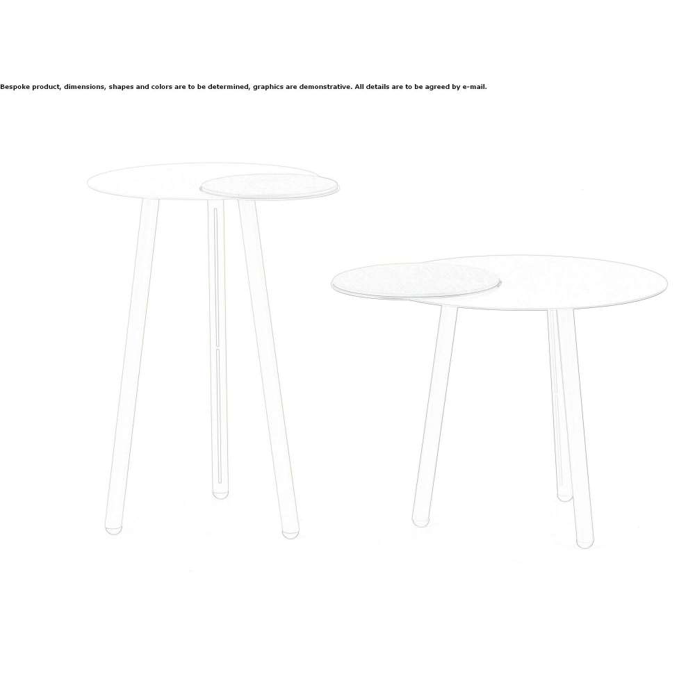 Stolik boczny Cloud składa się z dwóch różnych okrągłych blatów i trzech nóg, wyciętych laserowo z blachy stalowej, mniejsza mocowana za pomocą systemu magnetycznego, może być przesuwana w różnych pozycjach.