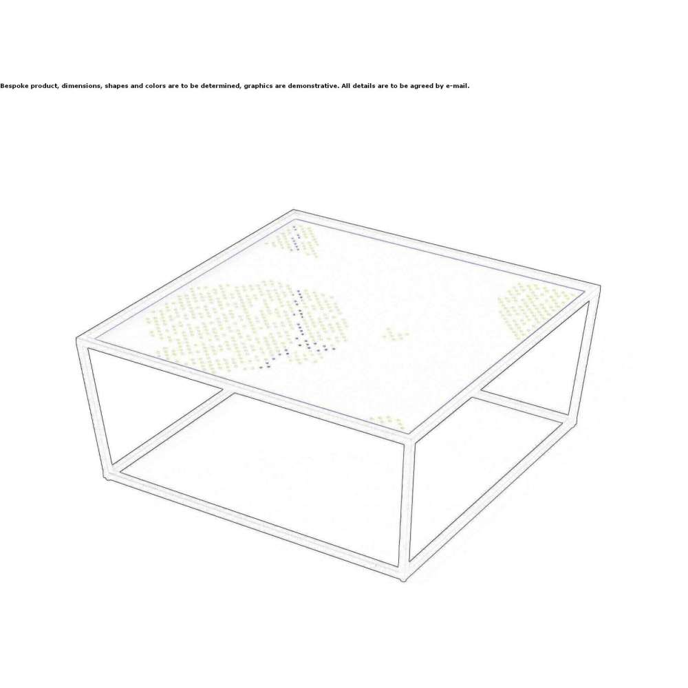 Stolik kawowy o konstrukcji stalowej i spawanym blacie z blachy serigrafowanej malowanej proszkowo z różnymi wykończeniami. Dostępny ze szklanym blatem o grubości 12 mm, lakierowany spód dostarczany osobno. Na zamówienie blaty marmurowe lub techniczne z ceramiki.
