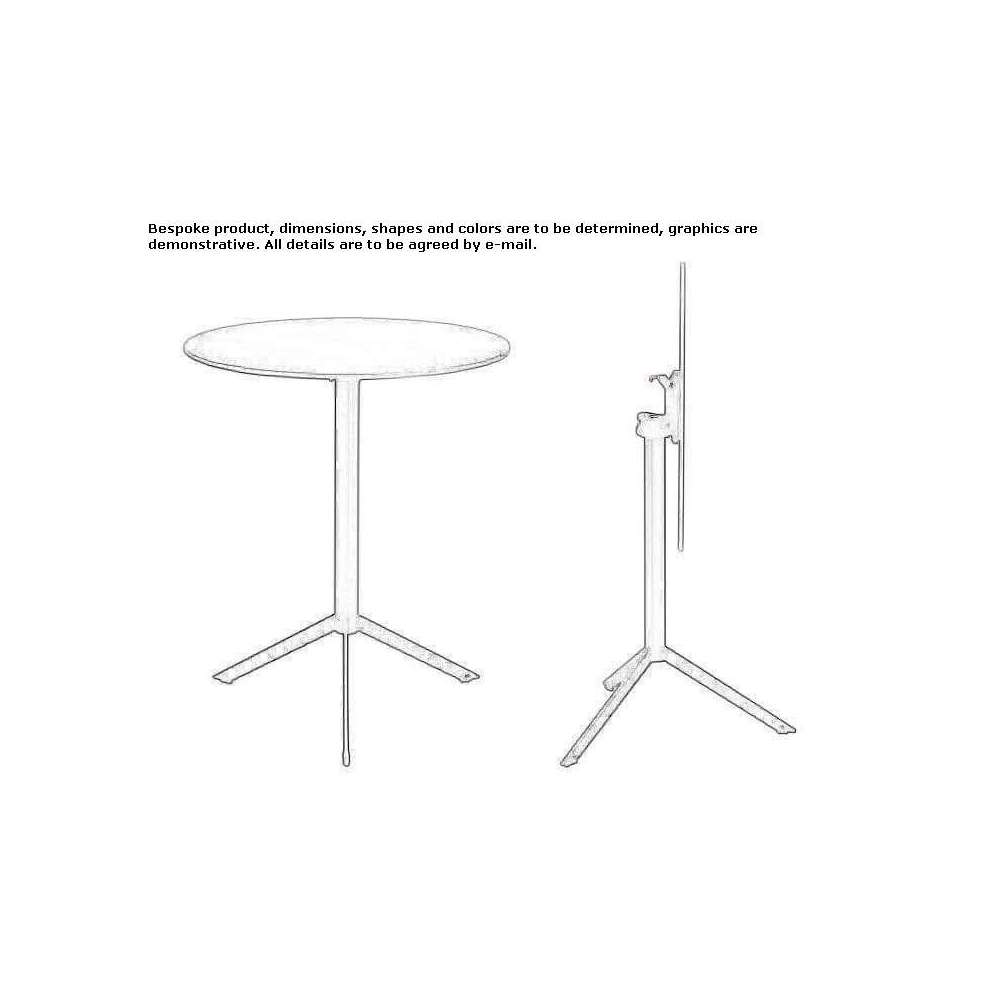 Składany stół bistro z możliwością układania w stosy. Blat można odchylić o 90°, co pozwala na poziome układanie stołu, a także można go zablokować za pomocą specjalnej dźwigni znajdującej się pod spodem. Konstrukcja z malowanego metalu i blat z warstwowego