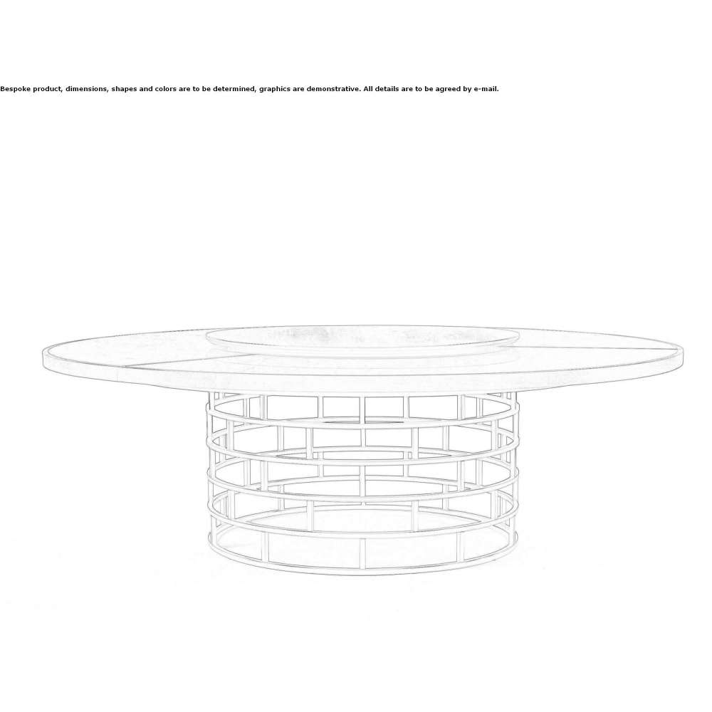 Stół CROWN jest okrągły i królewski. Centralna podpora złożona z okrągłej metalowej kratki wygląda prawie jak korona. Smukła, wizualnie lekka podstawa kontrastuje z blatem z litego drewna, który zawiera trzy duże marmurowe intarsje wstawione w drewnianą konstrukcję. Ponieważ stół ma dużą średnicę 240 cm, środek można wyposażyć w podręczną Leniwą Susan, aby goście mogli częstować się różnymi potrawami.