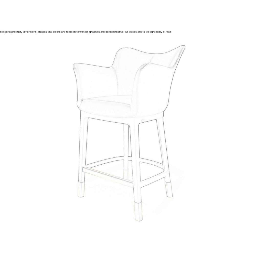 Jenn to stołek barowy z wygodnym siedziskiem i podłokietnikami ze skóry i detalami w kolorze satynowego złota. Stołek wykonany ręcznie we Włoszech i dostępny w tkaninie, aksamicie lub nabuku oraz w innych rozmiarach na zamówienie.