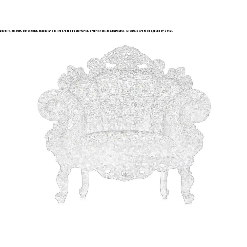 Ta nowa edycja kultowego fotela ma tradycyjną, ręcznie rzeźbioną i ręcznie malowaną drewnianą ramę ze stałym pokryciem wykonanym z wielobarwnego tkanina nawiązująca do wystroju ramy.