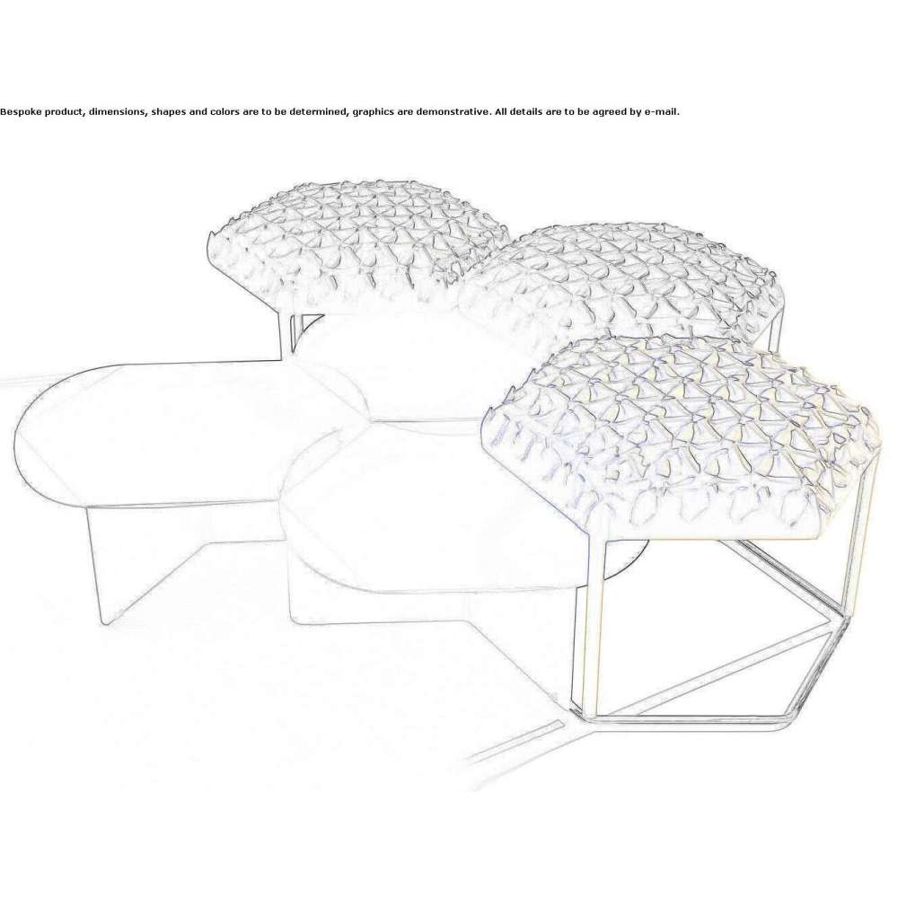 Otomana i stoły łączą się, tworząc oryginalne i poetyckie uzupełnienie wyposażenia. Trójwymiarowa powierzchnia tego pierwszego powstała w wyniku połączenia małych skórzanych „liście” wyrzuconych z procesu produkcyjnego. Ten ostatni jest wykonany ze złożonej blachy. Umiejętności rzemieślnicze i geometria podkreślają ekologiczny charakter tego akcesorium inspirowanego strukturą ula.