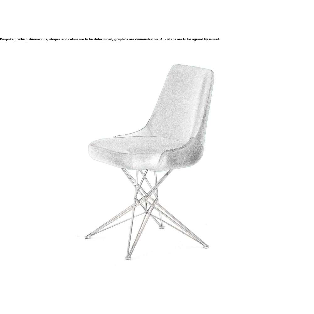 Trójwymiarowa lekkość nóg wykonanych z metalowego drutu kontrastuje z konstrukcją oparcia siedzenia, tworząc harmonijny efekt równowagi kształtu i objętości. Lekko zakrzywione oparcie siedzenia jest zebrane i otacza wyściółkę siedzenia, zapewniając ergonomiczny i dynamiczny komfort.