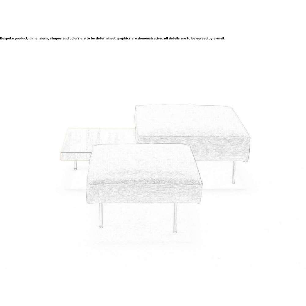 UPLAND to element składający się ze stolika kawowego i dwóch elementów do siedzenia, z ramą nośną ze stali malowanej proszkowo epoksydowo. Blat z płyty MDF o grubości 20 mm, fornirowanej płytami wiązu lub dębu termo, wykończony farbą akrylową na bazie wody. Elementy siedziska wielowarstwowe, wyściełane pianką poliuretanową pokrytą igłowaną, żywiczoną włókniną poliestrową, połączoną z poliamidowym aksamitnym podłożem. Nóżki ze stali nierdzewnej AISI 304 ø15mm, wykończenie matowo-satynowe, z regulowanymi końcówkami z czarnego PCV, przykręcane do podstawy za pomocą tulei.