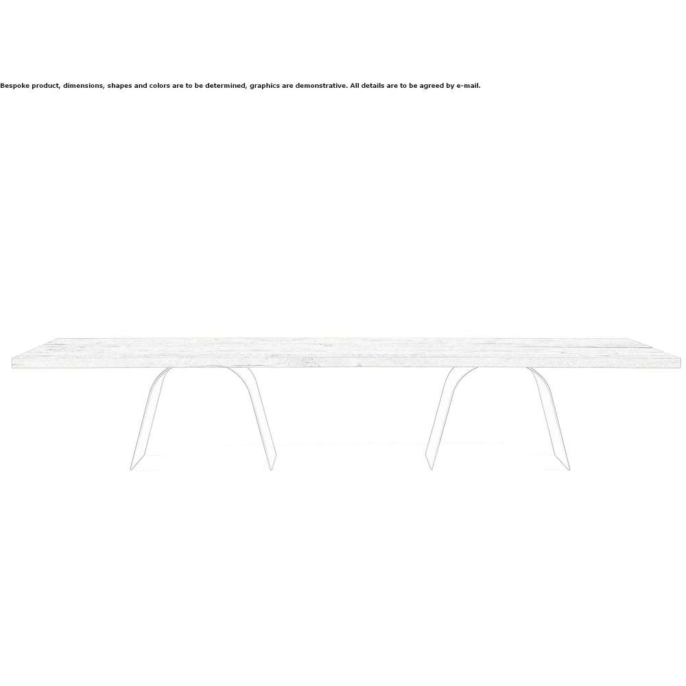Stół wykonany w mnożeniu o grubości 1 cm. fornir z antycznego, regenerowanego dębu, wiekowego od 80 do 350 lat, pozostawionego w stanie surowym, wiekowym, gdzie żyłki, pęknięcia, sęki i niedoskonałości stają się cechą specyficzną i charakterystyczną tego stołu.