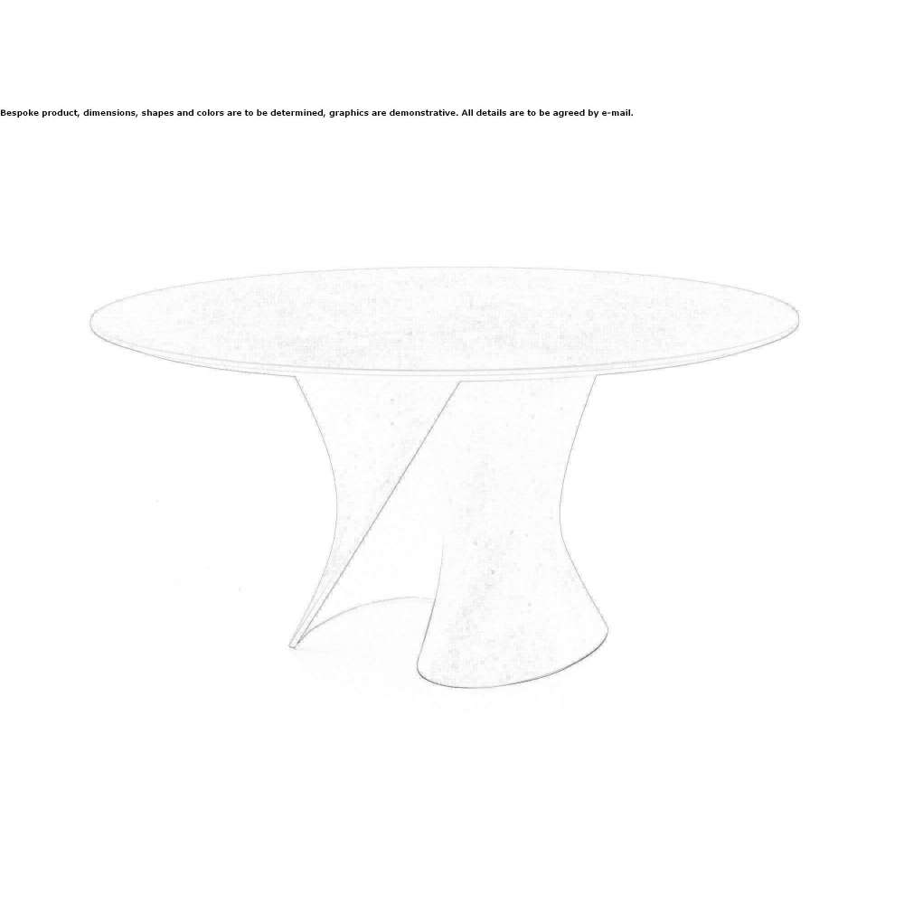 Struktura Okrągłe lub owalne stoły ze skręconą podstawą w kształcie litery S, formowane z:Cristalplant®, materiału kompozytowego składającego się z naturalnych minerałów oraz polimerów poliestrowych i akrylowych w matowej bieli; Ceramilux®, materiał na bazie naturalnych minerałów i żywicy poliestrowej, lakierowany na czarny połysk. Niedostępny w średnicy Ø126 cm; Kamień odtworzony otrzymywany jest z mieszanki proszków mineralnych, które zostały zmikronizowane i zmieszane z płynnym akrylem i produktami na bazie wody, nadając mu materialną esencję. Wykończenia nakładane są ręcznie za pomocą szpachelki na całą powierzchnię stołu, tworząc niepowtarzalną fakturę, która charakteryzuje każdy produkt, zarówno pod względem wzrokowym, jak i dotykowym. Po aplikacji wymagany jest proces dojrzewania w temperaturze pokojowej; materiał jest następnie zabezpieczany nanotechnologicznym wykończeniem na bazie wody, które sprawia, że stół jest wytrzymały i łatwy do czyszczenia. Wykończenia: Zrekonstruowany biały kamień i czarny łupek.