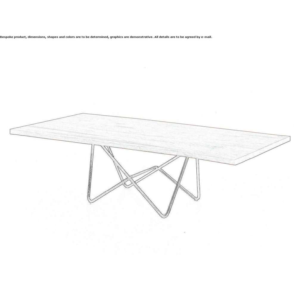 Piano Design to stół z blatem z litego drewna w klejonych listwach i prostymi bokami, połączony z podstawą z ciągnionego żelaza, chromowanym wykończeniem na półpołysk z sekcją rurową.