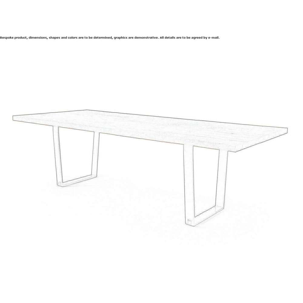 DT Table Squared to stół z blatem z litego drewna klejonego i prostymi bokami, charakteryzujący się żelazną podstawą z nogami w kształcie litery U łączonymi na gołębie ogony.