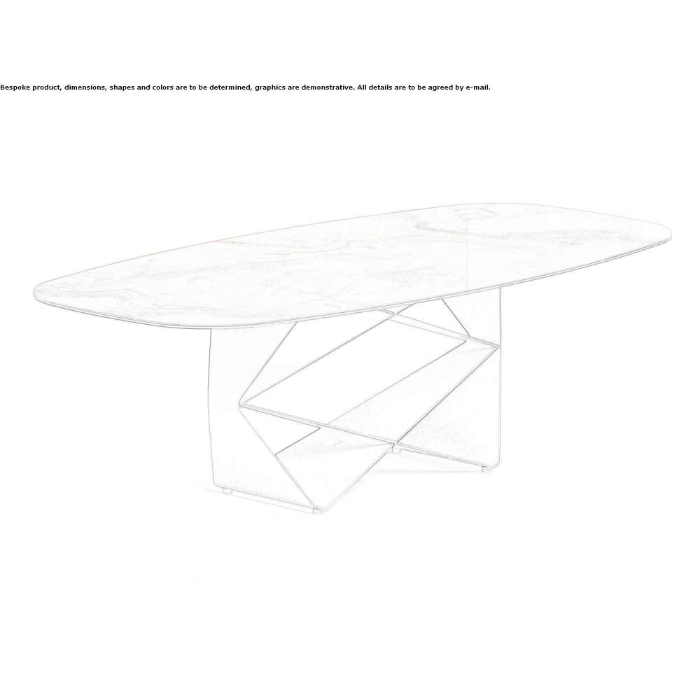 Prostota różnych szklanych blatów stołu Gem, z podwójnie ukształtowaną, ściętą krawędzią szlifującą i prostą, szlifowaną, polerowaną krawędzią, podkreślają zasadniczą dynamikę metalu baza w podwójnym odcieniu chromatycznym lub w pojedynczym kolorze. Mocne geometryczne sploty metalowej podstawy przyciągają uwagę mieszkańców i nadają tym meblom niepowtarzalną osobowość.