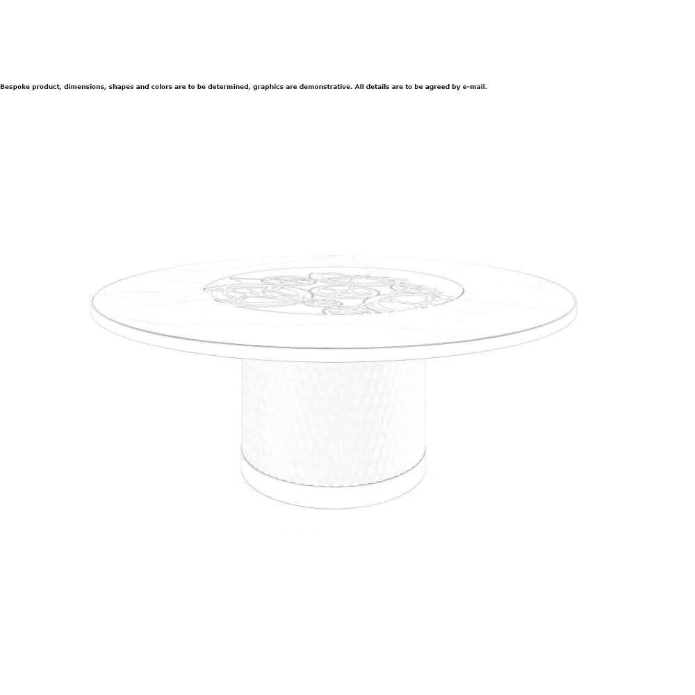 Big Ben 72 to stół do jadalni z cylindryczną podstawą tapicerowany skórą CAT.C lub NABUK z pikowaniem. Drewniany blat o grubości 40 mm z pokrywą z Marmoreflex/Legnoreflex. Krawędź górnej i dolnej części cylindra w wykończeniach metalicznych (brąz (100M), mosiądz (104), ciemny mosiądz (105M9, tytan (101M), miedź (107M), złoto (103M)). Susan z przezroczystego szkła z zębatkami w kolorze błyszczącego złota i chromu na podstawie ze szkła Mesh.