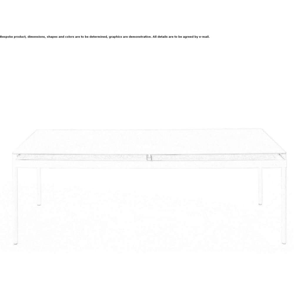 Stoły, małe stoliki i konsole ze stalową ramą i szufladami, blaty ze szkła hartowanego 8 mm lub ceramiki 6 mm. Szuflady na prowadnicach kulkowych z pełnym wysuwem. Akcesoria do przechowywania szuflad z czarnego, nadającego się do prania neoprenu (opcjonalnie).