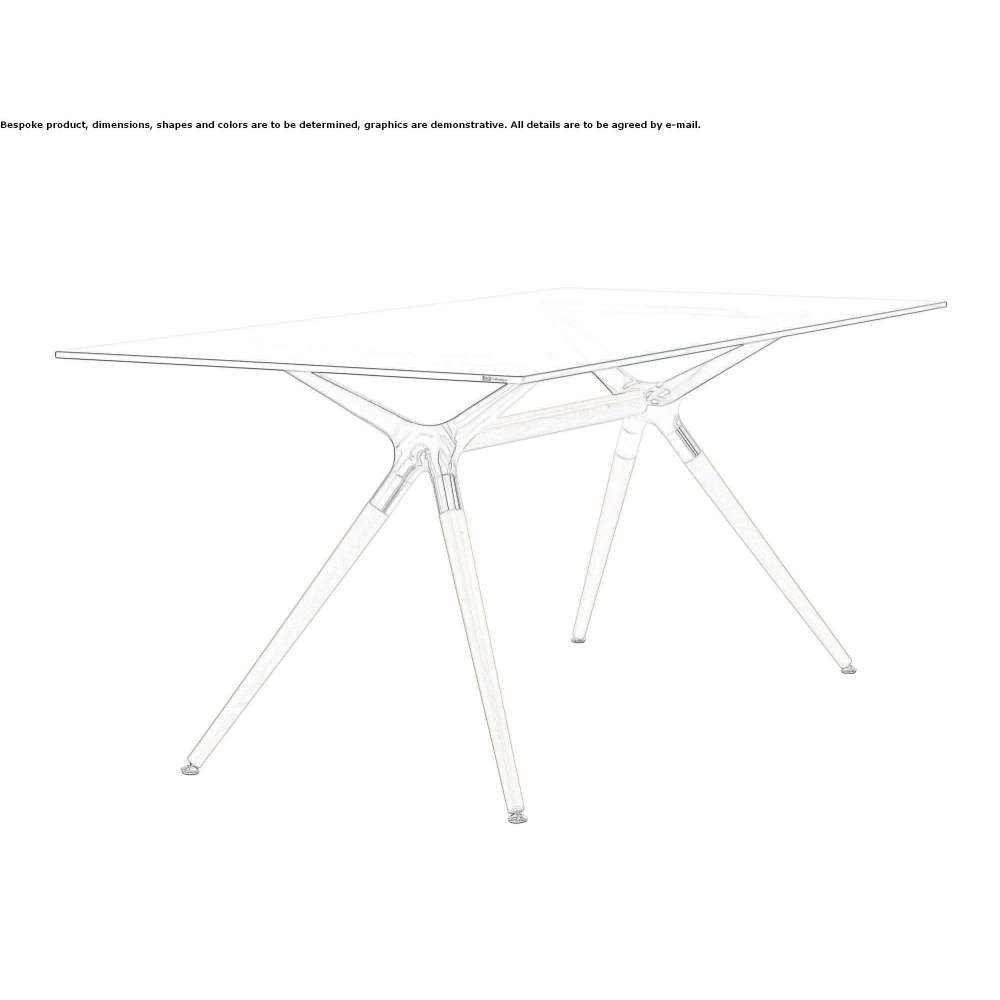 Lekkość bytu zastąpiona solidnymi nogami z naturalnego drewna bukowego. Szklany blat sprawia, że to, co niewidoczne, staje się widoczne, nie tracąc przy tym odporności, a drewno w połączeniu z aluminium ramy gwarantuje równowagę i spokój. Stół z prostokątnym lub owalnym blatem ze szkła hartowanego o grubości 12 mm, dostępny w różnych rozmiarach. Nogi oraz długa lub krótka poprzeczka ramy wykonane są z naturalnego drewna bukowego. Wsporniki blatu z polerowanego, odlewanego ciśnieniowo aluminium. Regulowane, obrotowe nóżki. Wymiary: 180x100x75 cm, 180x90x75 cm, 160x90x75 cm, 150x112x75 cm, 140x85x75 cm, ø 120x75 cm i ø 100x75 cm.
