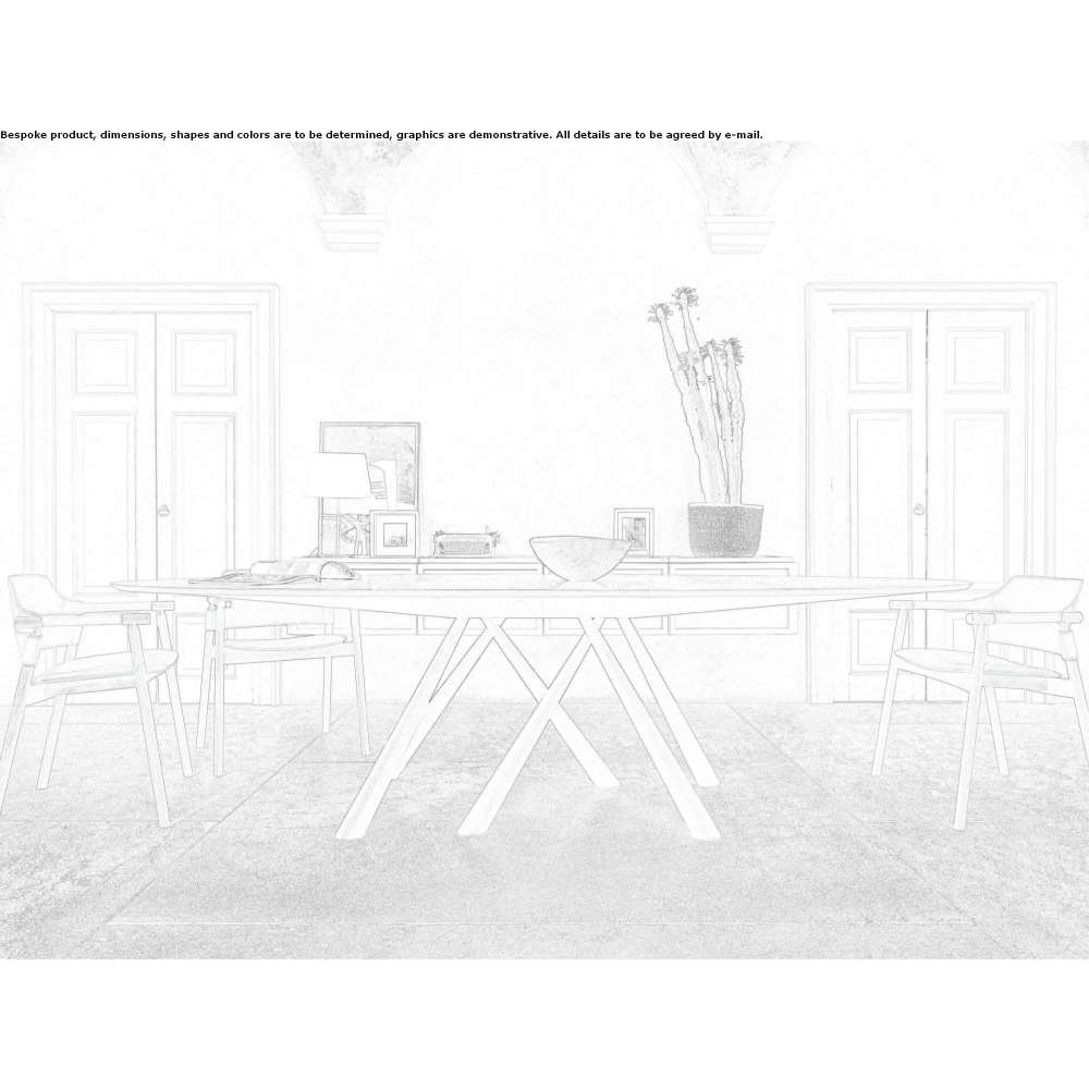 Stały stół z lakierowaną stalową podstawą. Blat z fornirowanego drewna lub ceramiki kryształowej.