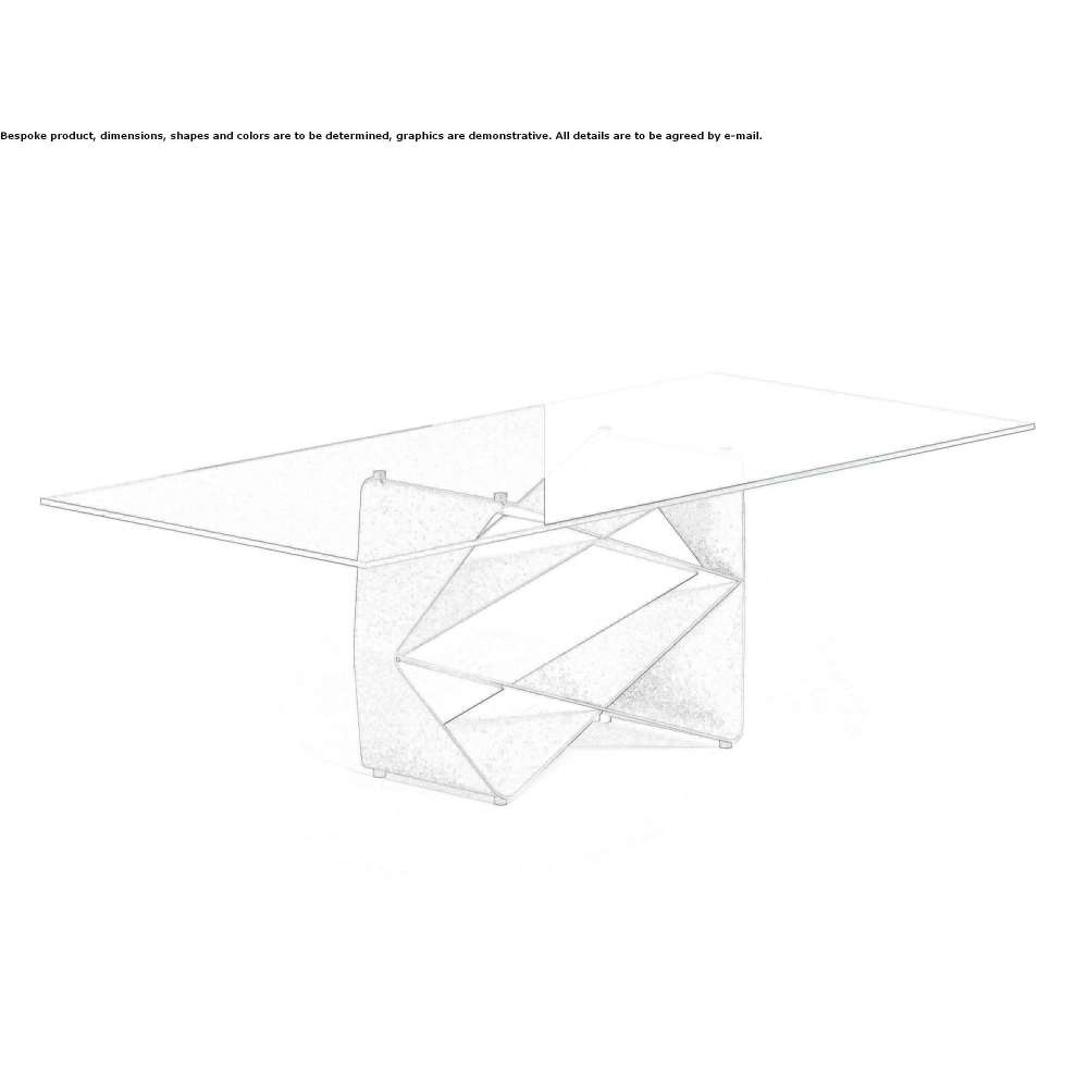 Prostota różnych szklanych blatów stołu Gem, z podwójnie ukształtowaną, ściętą krawędzią szlifującą i prostą, szlifowaną, polerowaną krawędzią, podkreślają zasadniczą dynamikę metalu baza w podwójnym odcieniu chromatycznym lub w pojedynczym kolorze. Mocne geometryczne sploty metalowej podstawy przyciągają uwagę mieszkańców i nadają tym meblom niepowtarzalną osobowość.