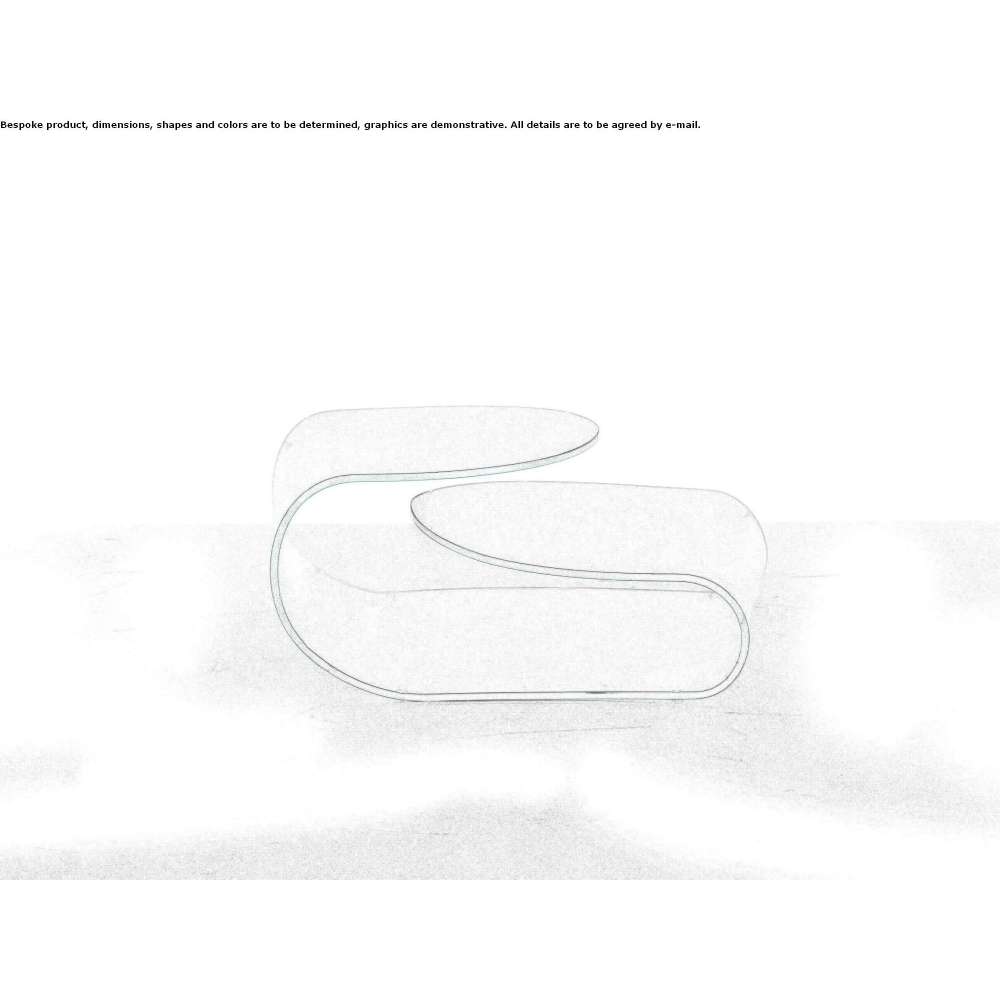 Lina wirująca wokół siebie, ułożona poziomo, aby zapewnić zarówno wsparcie, jak i miejsce do przechowywania. Zakrzywione szkło działa jako konstrukcja i blat, w przezroczystych i wyjątkowo przezroczystych wykończeniach.