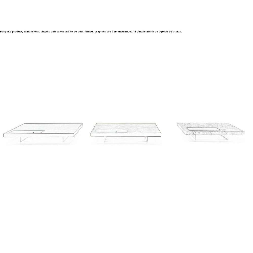 Alternatywnie, blat z marmuru Grigio Orobico ma obniżoną metalową tacę z wykończeniem w kolorze złotego brązu, podobnie jak nogi. Krawędź tacy wystaje od góry o 15 mm.