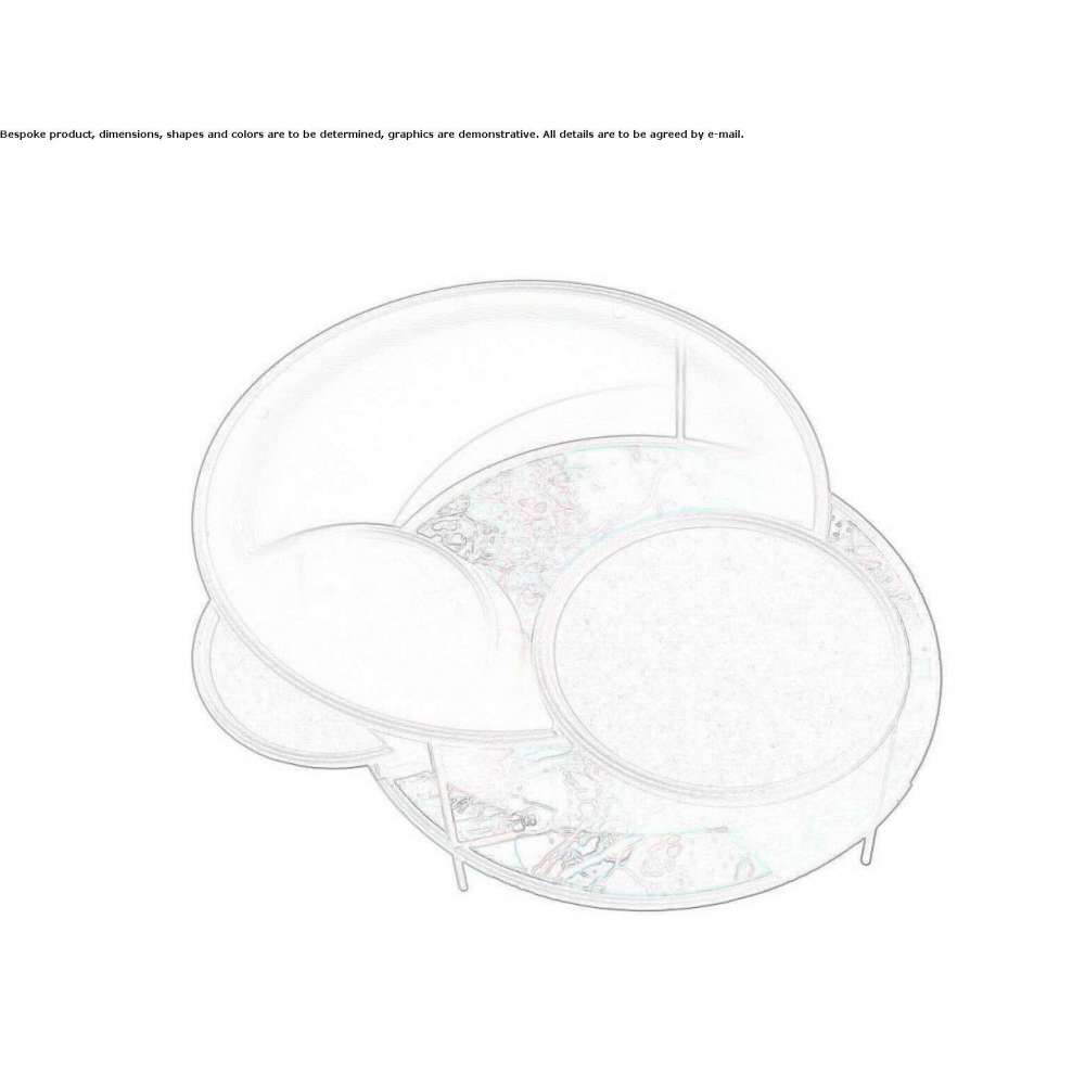 Mały stolik złożony z czterech okrągłych blaty zachodzą na siebie w dwóch średnicach 82 i 42 cm. „Geometryczna” konstrukcja stołu opiera się na wpisanych między nie okręgach, aby uzyskać wymiary całkowite 100x82 cm i wysokość 41 cm. Okrągła konstrukcja podtrzymująca blaty ze stalowej rury o średnicy 20 mm i pionowe elementy nośne ze stalowego pręta o średnicy 12 mm, wszystkie pomalowane proszkiem poliestrowym, z wykończeniami w kolorze niebieskim, zielonym, żółtym i antracytowym. Blaty z blachy stalowej o średnicy 42 cm. aby dopasować kolorystykę konstrukcji. Dolna półka wykonana z blachy 6mm. wyjątkowo przezroczyste szkło o średnicy 82 cm. ozdobiony nadrukiem cyfrowym w czterech różnych grafikach pasujących do kolorów konstrukcji. Blat z wyjątkowo przezroczystego szkła warstwowego o grubości 3 + 3 mm, średnica 82 cm, drukowany cyfrowo w szarym gradiencie. Tylko do użytku w pomieszczeniach.