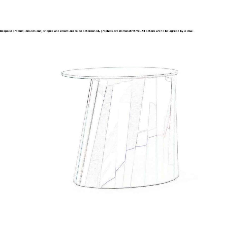 Stolik boczny. Podstawa składana z blachy nierdzewnej polerowanej na wysoki połysk, w różnych kolorach, barwiona specjalną metodą. Blat owalny, lakierowane w kolorze szkło kryształowe. Szybowce filcowe w kolorze czarnym.