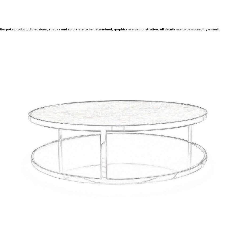Powyżej i poniżej: dwie zmienne powierzchnie – okrągła lub kwadratowa – zwrócone ku sobie, nigdy się nie stykając. Obydwa blaty oddziałują na siebie zdalnie i obejmują onyks etruski, biały marmur posągowy, marmur Calacatta, lakierowane drewno, szkło w kolorze brązu, wsparte prostą chromowaną metalową ramą. Tak rodzi się elegancja.