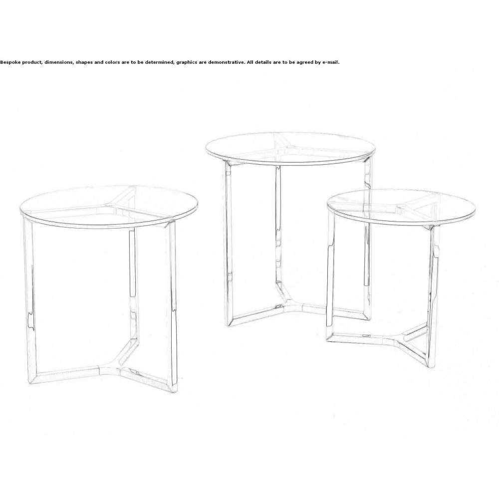 Raj 2. Stolik kawowy z przezroczystym szklanym blatem o grubości 8 mm. Szkło malowane według wzorów w wersji jasnej lub satynowej na zamówienie. Konstrukcja z jasnej stali nierdzewnej (20x20x1,5 mm). Część środkowa z chromowanego aluminium. Dostępny również z blatem ze szkła wędzonego „grigio Italia” i konstrukcją z polerowanego metalu.