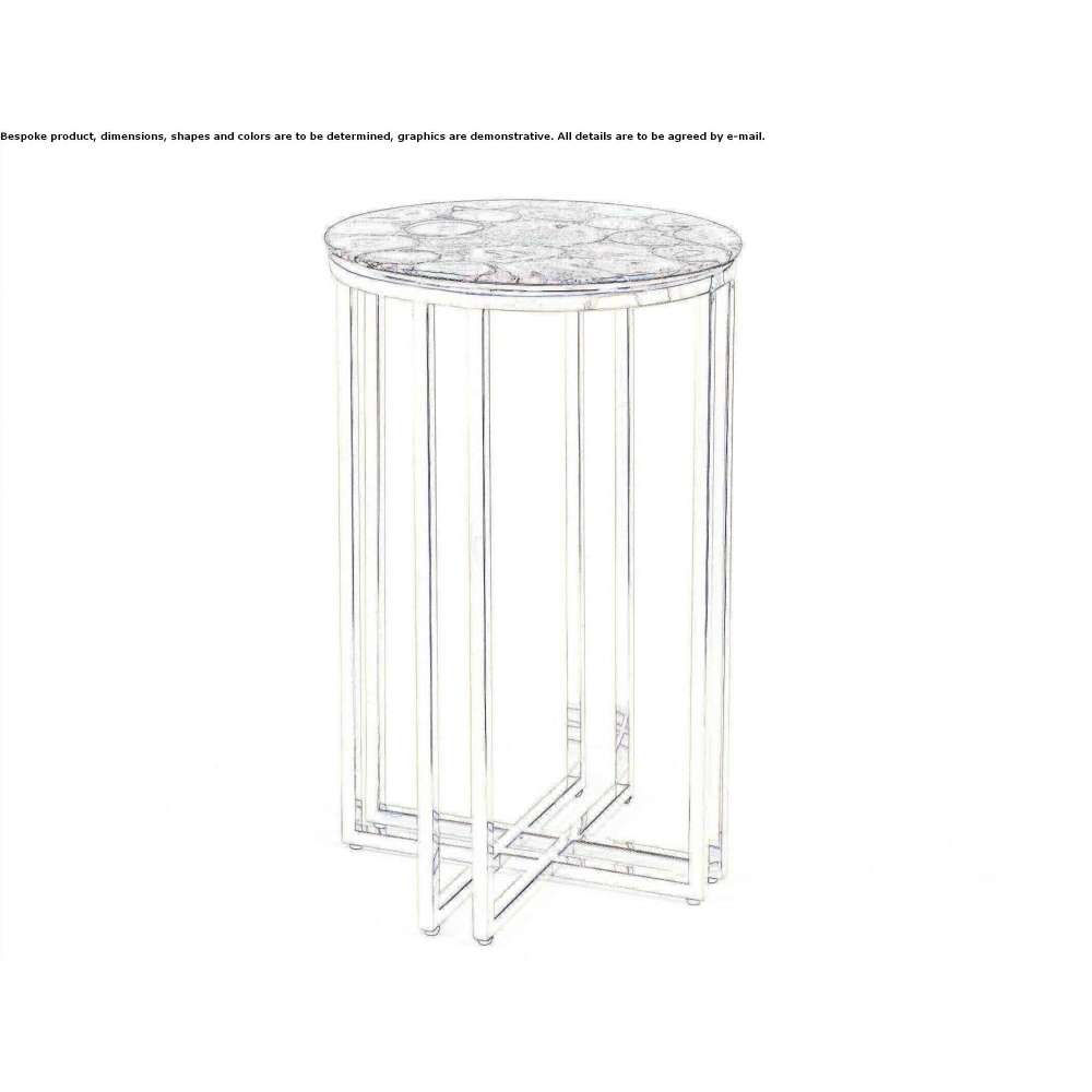 Okrągły stolik kawowy o metalowej konstrukcji i marmurowym blacie. Dzięki naszemu stolikowi kawowemu Agate żadne pomieszczenie nie będzie szare ani nudne. Wiele odcieni błękitu i wyjątkowa przezroczystość to tylko niektóre z cech charakterystycznych tego niesamowitego kamienia półszlachetnego znanego jako indyjski agat. Połączyliśmy je ze złotym metalem (na konstrukcję nośną), który doda koloru i pozytywnej energii każdemu otoczeniu. Niezależnie od tego, czy zostanie użyty w salonie jako luksusowy stolik kawowy, czy w sypialni jako stolik nocny, doda Twojemu pomieszczeniu charakteru dzięki leczniczym właściwościom agatu.