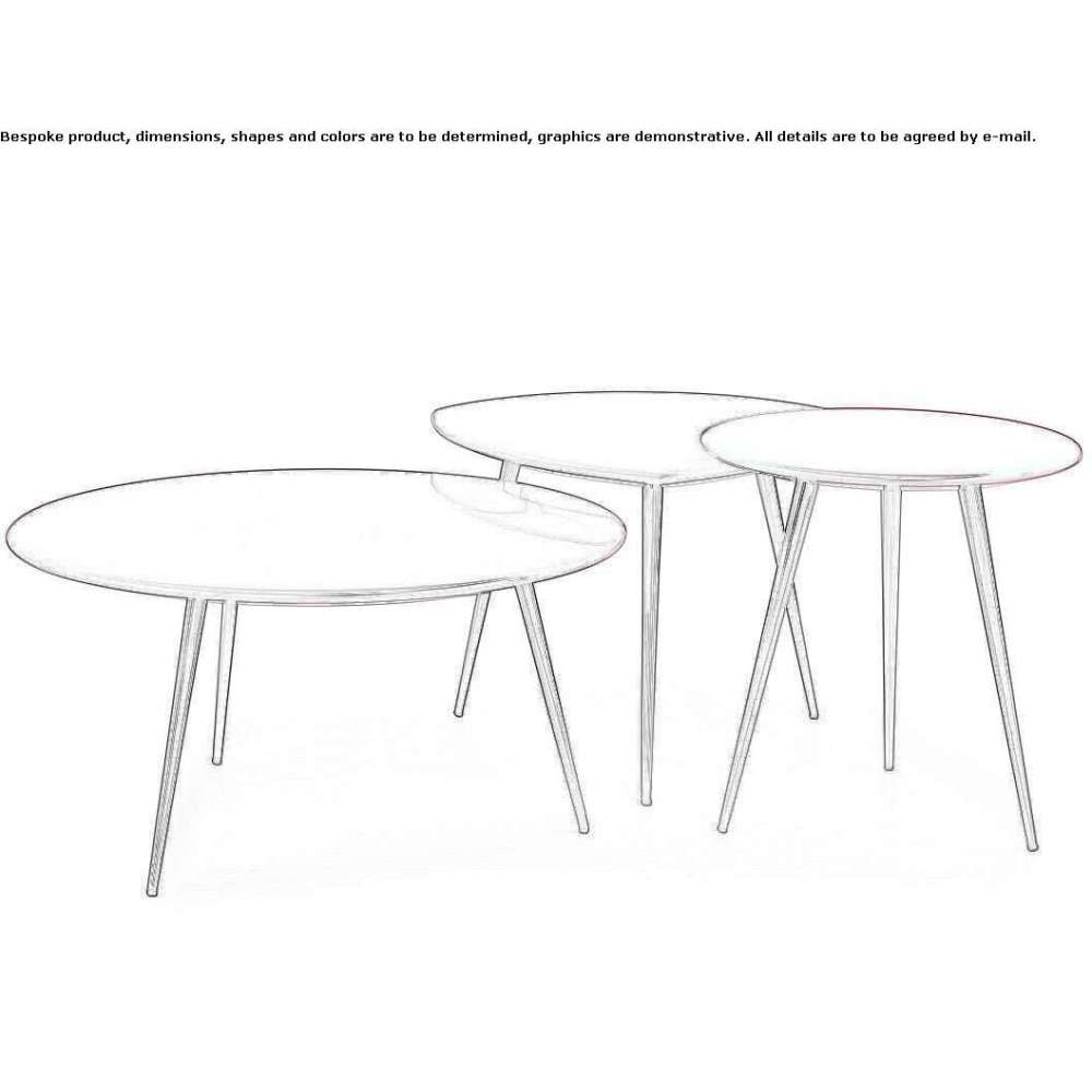 Stolik kawowy owalny, okrągły w dwóch wymiarach (średnica 80 i 50 cm), trójkątny i prostokątny z zaokrąglonymi narożnikami. Podpory dostępne są w różnych wysokościach, a blaty można wówczas dopasowywać i częściowo nakładać na siebie, tworząc zawsze różnorodne powierzchnie i kompozycje. Zabawa kształtami i kolorami. Blaty z