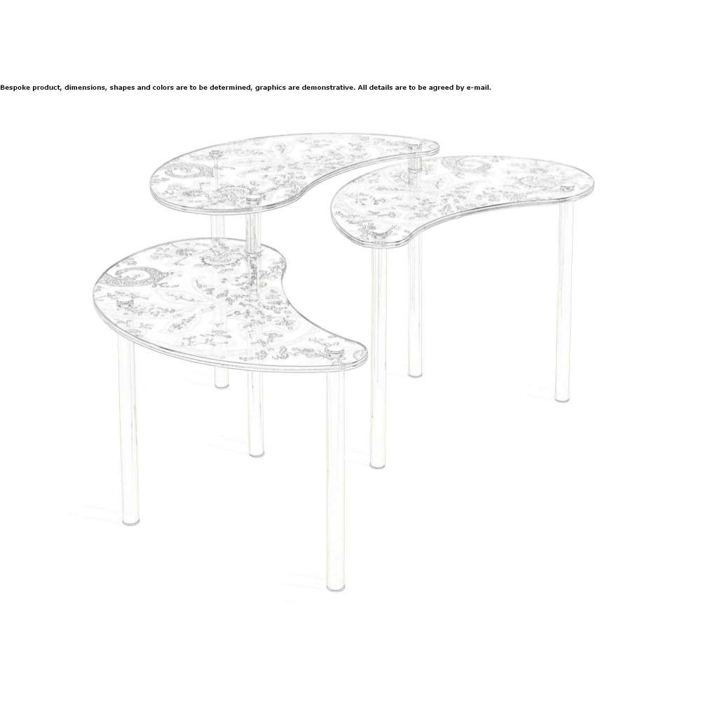 Subtelna gra kształtów i przezroczystości w małym stoliku Krishna o wyrafinowanej kompozycji, składającej się z trzech blatów z wyjątkowo przezroczystego szkła hartowanego, o różnych wysokościach, każdy z symbolicznym kształtem kropli. Bezpośrednie nawiązanie do paisley, starożytnego motywu inspirowanego pąkiem palmy daktylowej, „drzewa życia”, występującego również jako element dekoracyjny wzbogacający samo szkło. Kompozycję wspierają nogi z polerowanego mosiądzu, które tworzą wyrafinowany zestaw, który może delikatnie ozdobić klasyczne lub współczesne wnętrza.