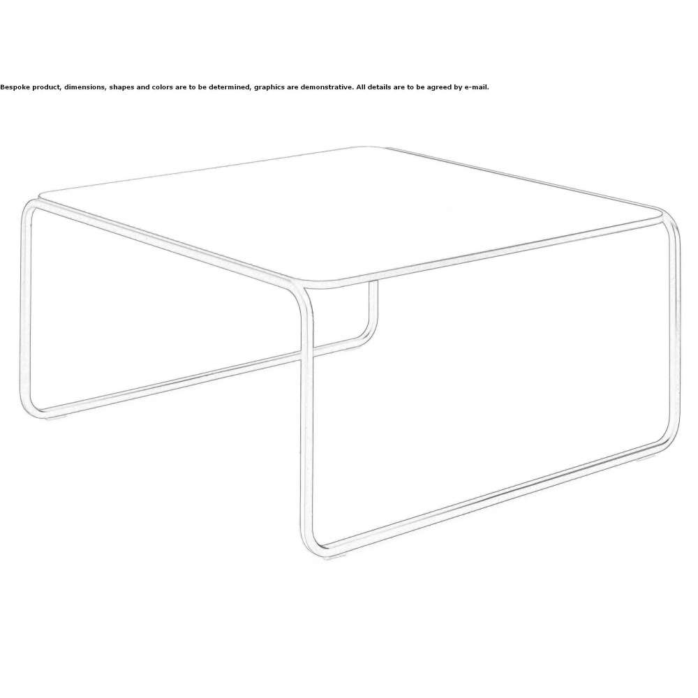 Stoliki kawowe o różnych rozmiarach i wysokościach, które można na siebie nakładać. Rura o przekroju kwadratowym ze stali malowanej proszkowo z blatem z HPL.