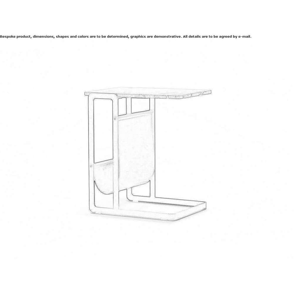 Cleo to kompaktowy, elastyczny i funkcjonalny stolik boczny. Posiada kieszeń do przechowywania i stojak na czasopisma z ekoskóry, prostokątny marmurowy blat i czarną metalową konstrukcję.